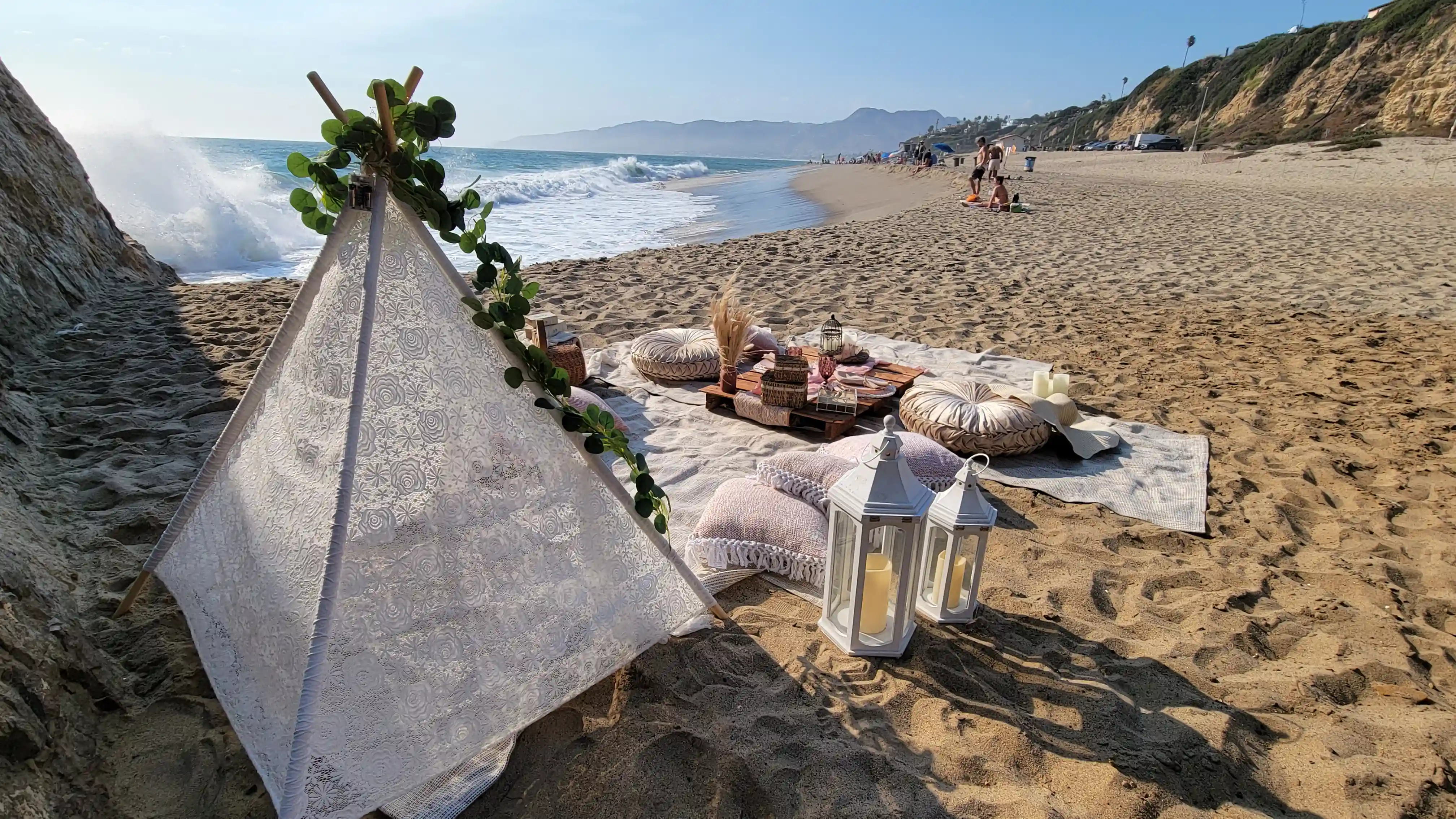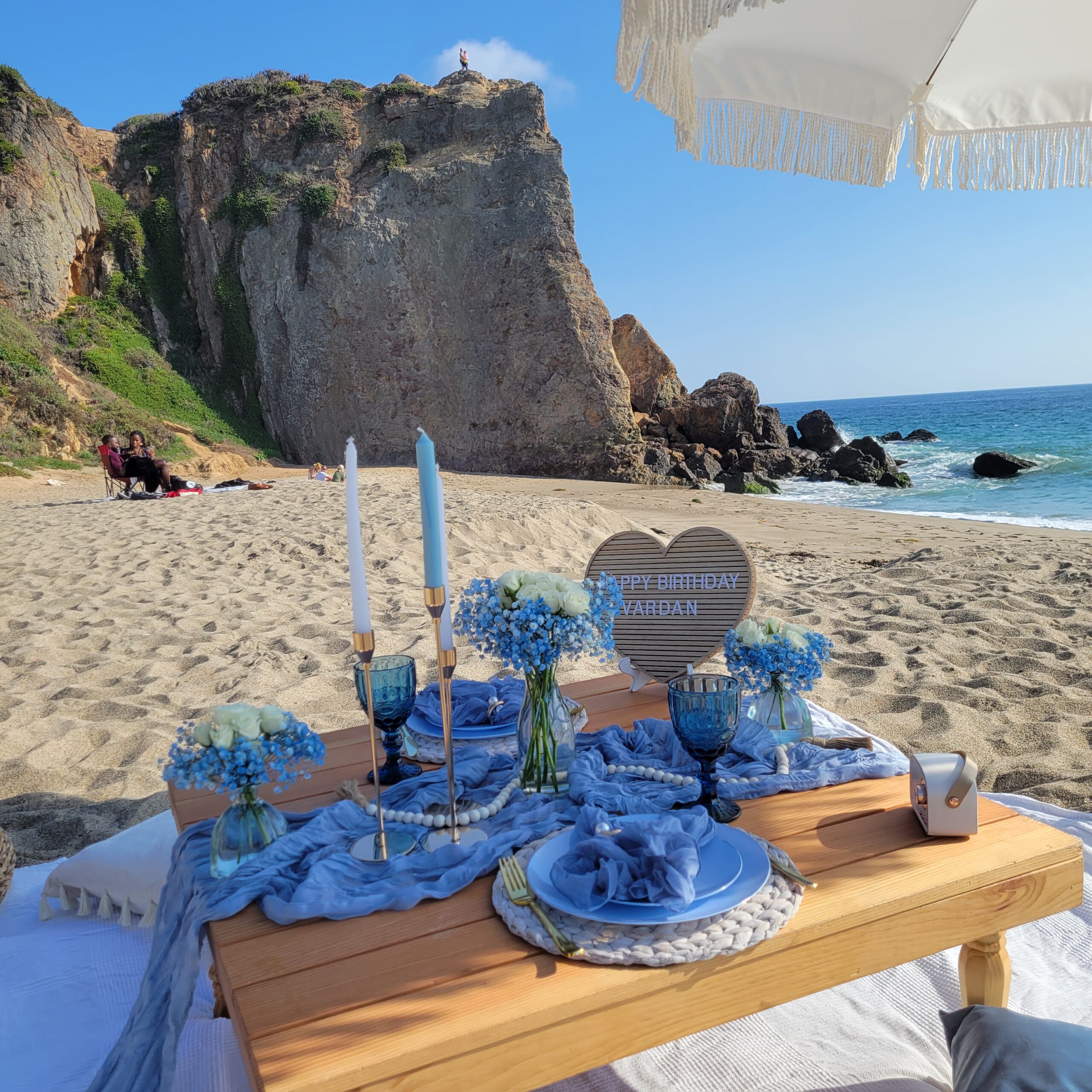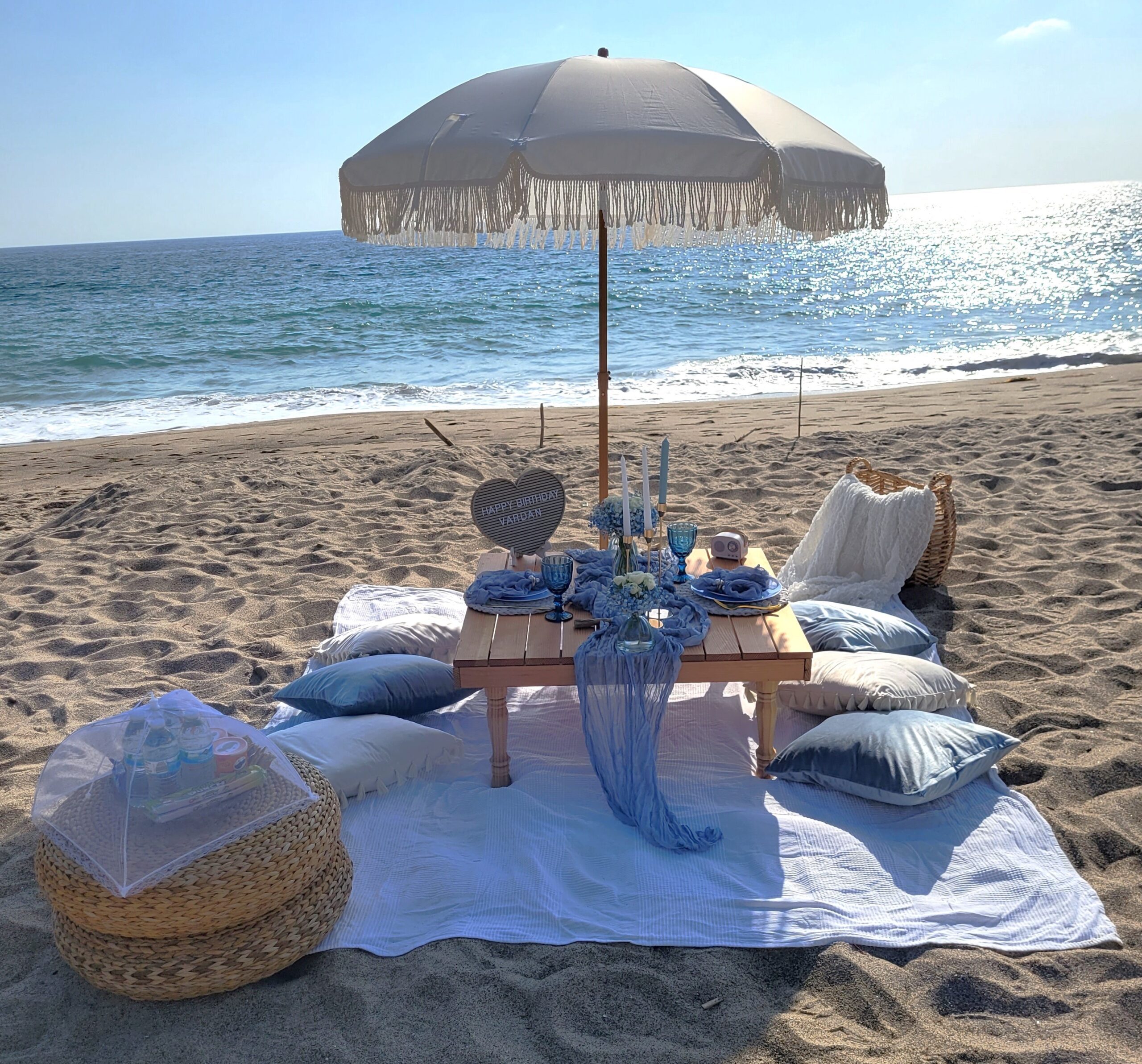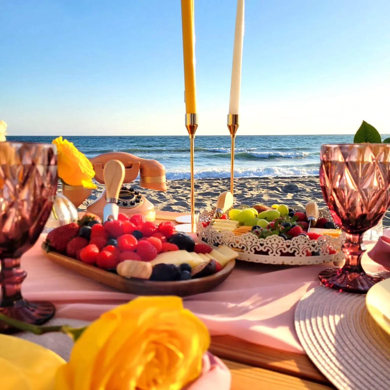 An intimate luxury picnic set on the shoreline at sunset—soft cushions, glowing candles, and elegant details arranged in the sand as waves crash nearby. A couple embraces against the pastel sky, creating a romantic, serene moment where coastal beauty meets refined indulgence.