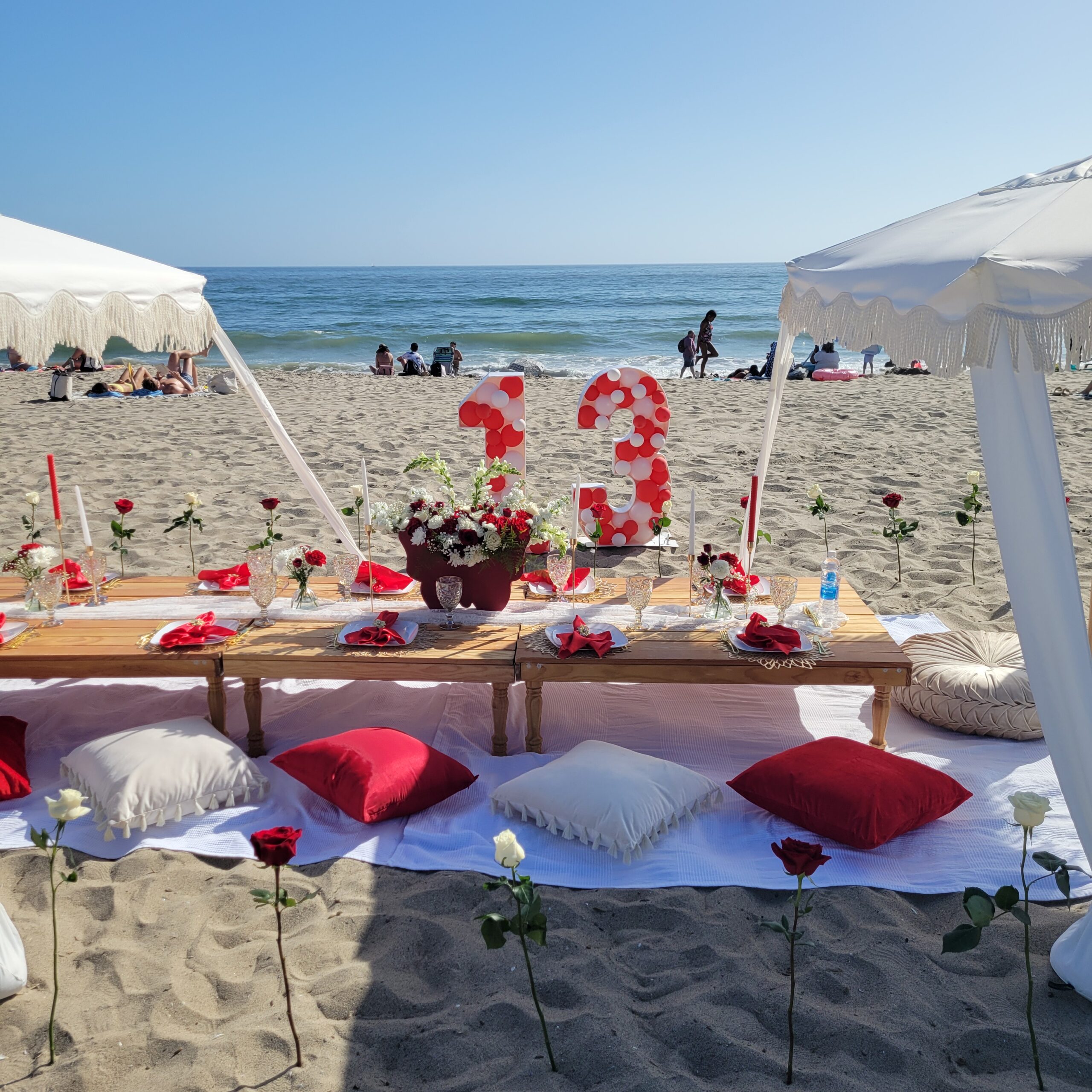 A Beach picnic in Red & Pink, decorated with a flower arch.