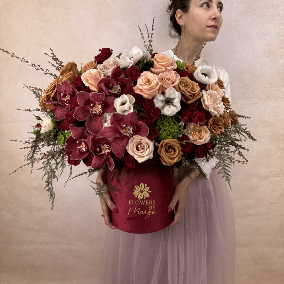 This stunning arrangement showcases pristine white anemones that contrast beautifully with deep burgundy orchids. Romantic roses add a classic touch, while the vibrant green hydrangea creates a lush, textural backdrop. The combination of colors and shapes creates a striking yet elegant display, perfect for a variety of settings. PREMIUM size pictured
