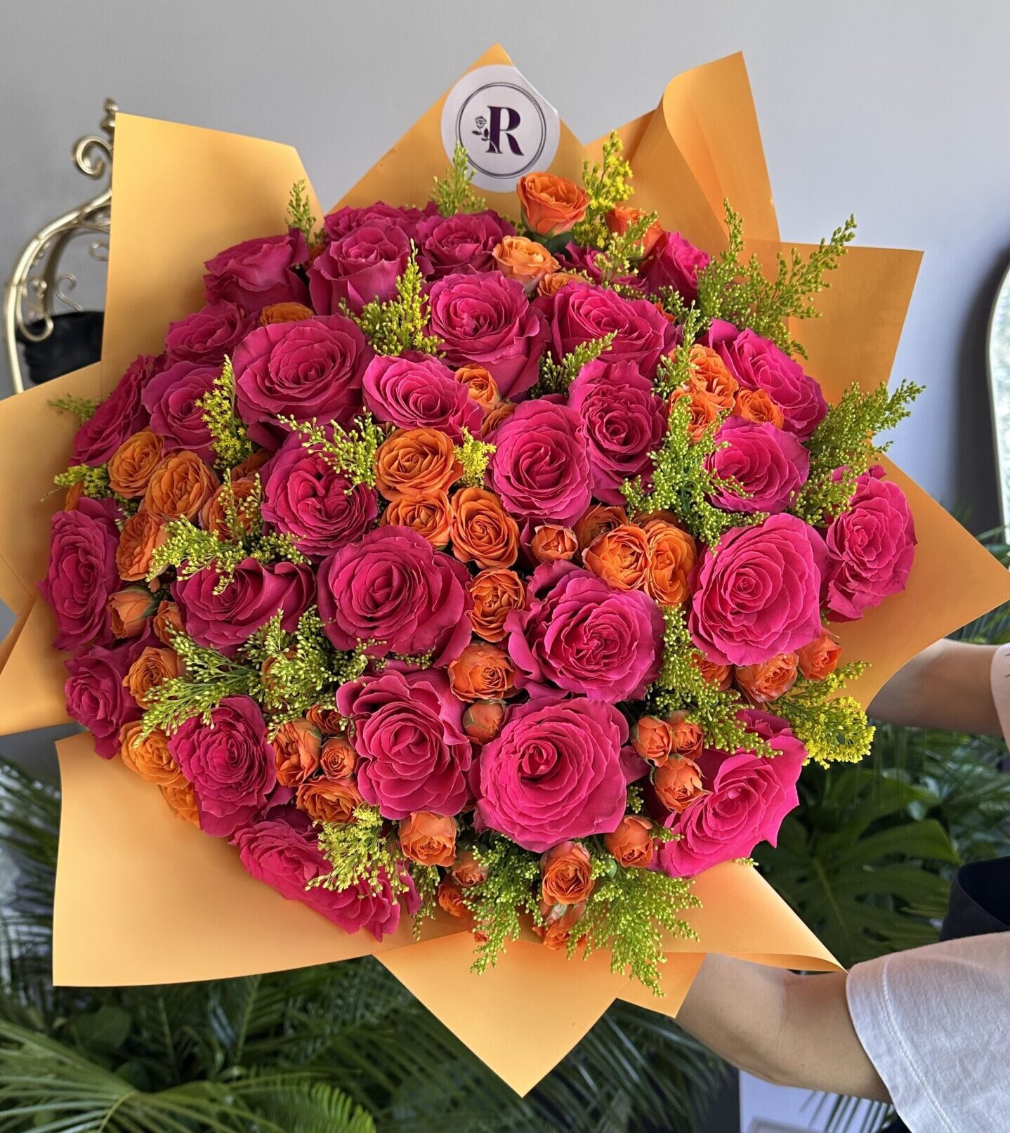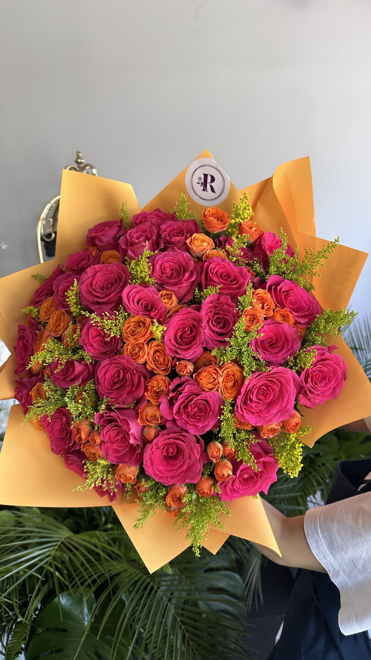 A radiant fall bouquet featuring fuchsia colored and orange roses, golden solidago, and lush seasonal greenery. Handcrafted by our West Hollywood florists, this elegant design captures the warmth of autumn. Perfect for Thanksgiving gifting and any occasion. Same-Day Delivery is usually available in white, red, peach, and pink. This bouquet comes without a vase. You can select a glass vase from the add-ons shown. SEASONAL or unavailable colors can be replaced with similar ones. DELUXE size is shown in the main picture.