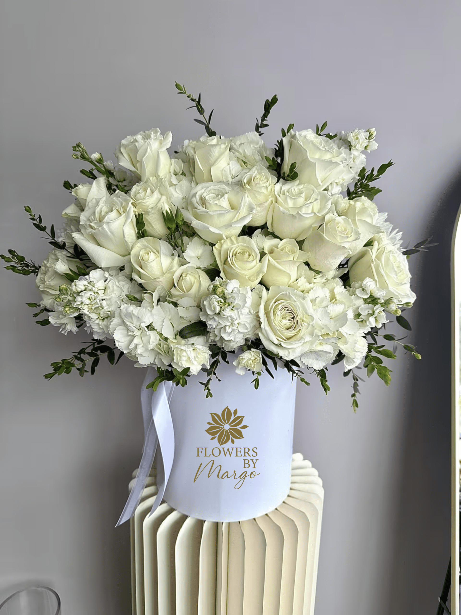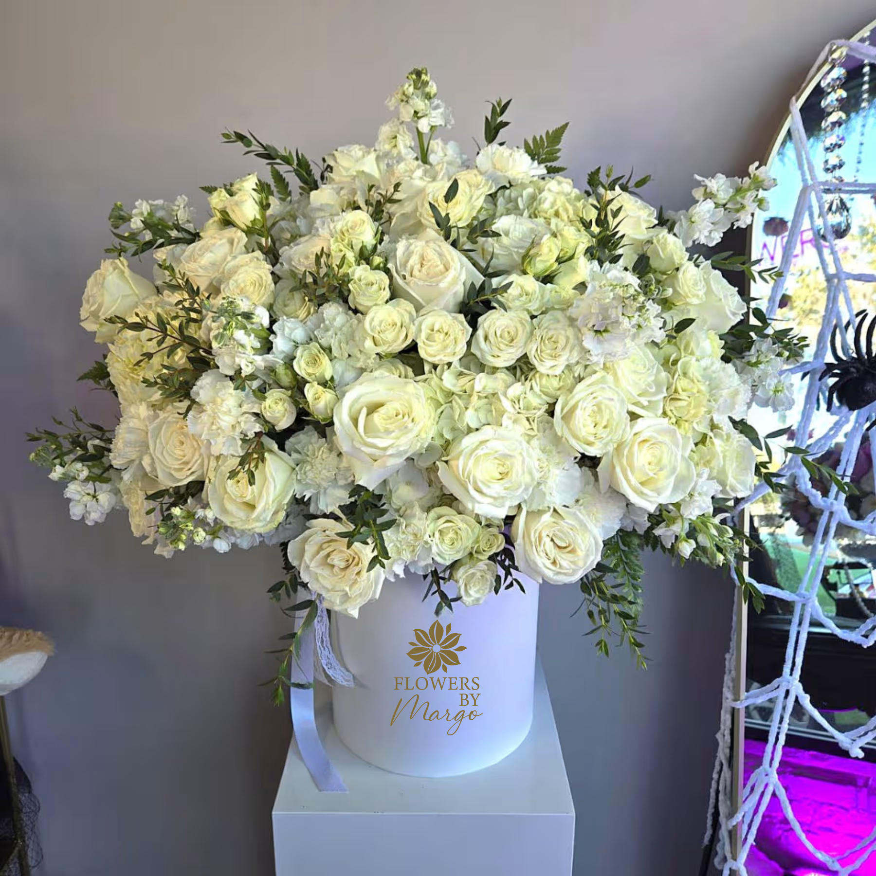• This stunning floral arrangement showcases a luxurious blend of fresh white blooms, artfully designed in a sleek white box. Featuring elegant roses, lush hydrangeas, and delicate stock, it’s accented with touches of greenery for a balanced and refined look. Branded with the “Flowers By Margo” logo and finished with a satin ribbon. This arrangement is perfect for weddings, anniversaries, sympathy gestures, or upscale gifting.