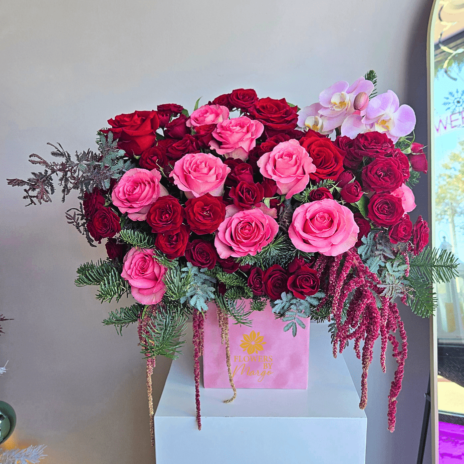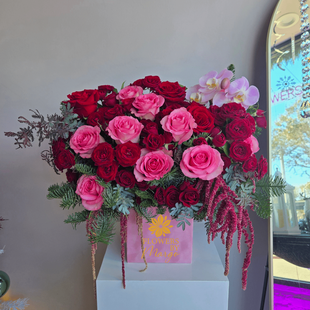 • This festive arrangement brings together lush red and soft pink roses, winter greenery, silvery accents, cascading amaranthus, and a delicate touch of orchids — all styled in a rich velvet box that adds warm, luxurious holiday charm. The combination of romantic colors and Christmas textures creates an elegant, cozy centerpiece perfect for gifting or elevating any holiday celebration.