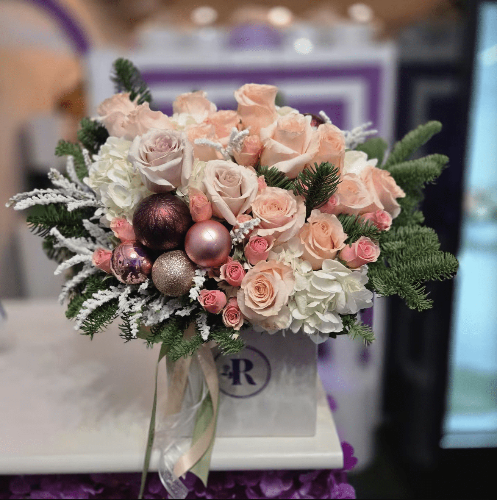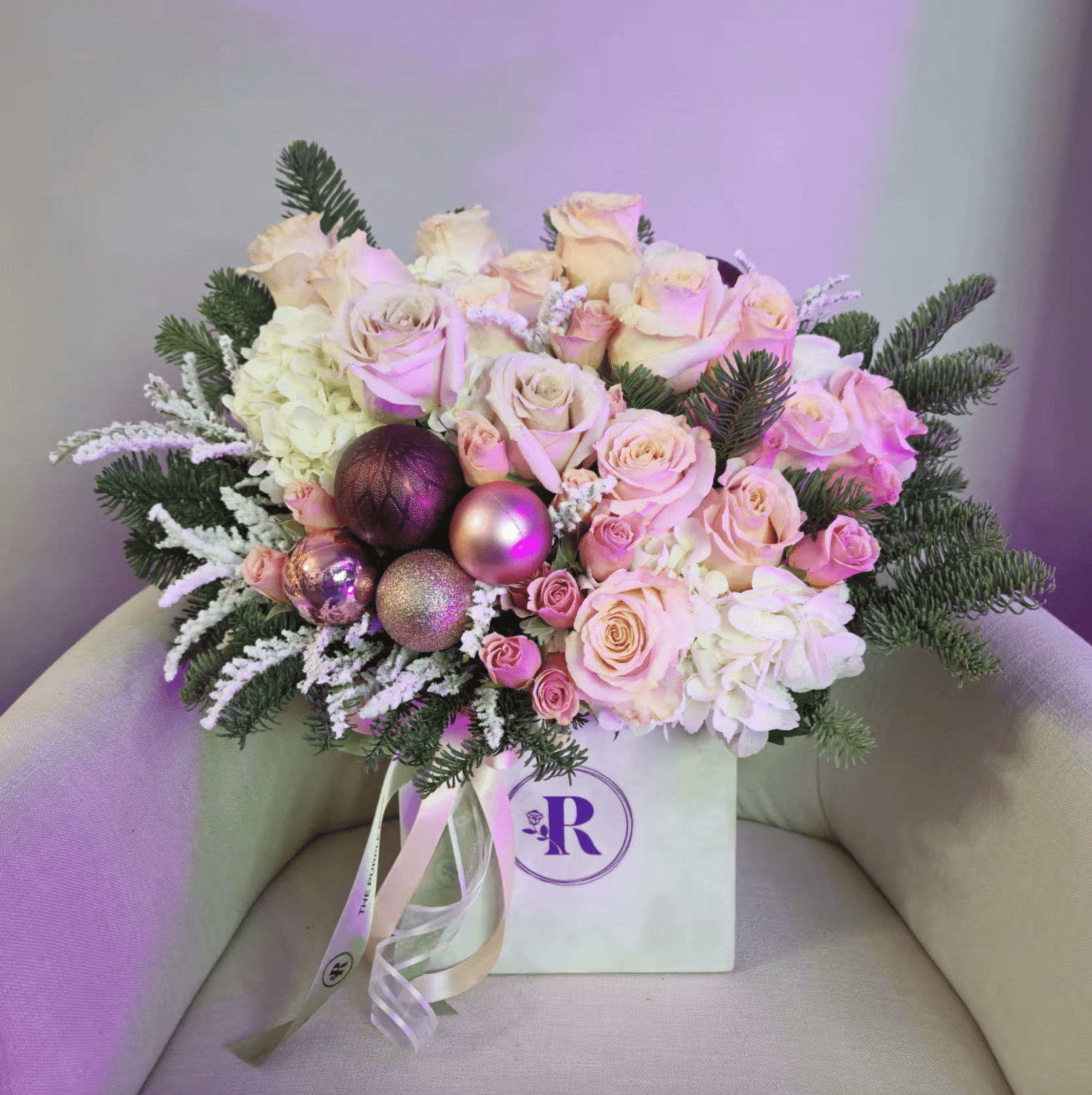 "Christmas Mood" is an arrangement with fir-tree toys in a square or round box. DELUXE SIZE in the picture