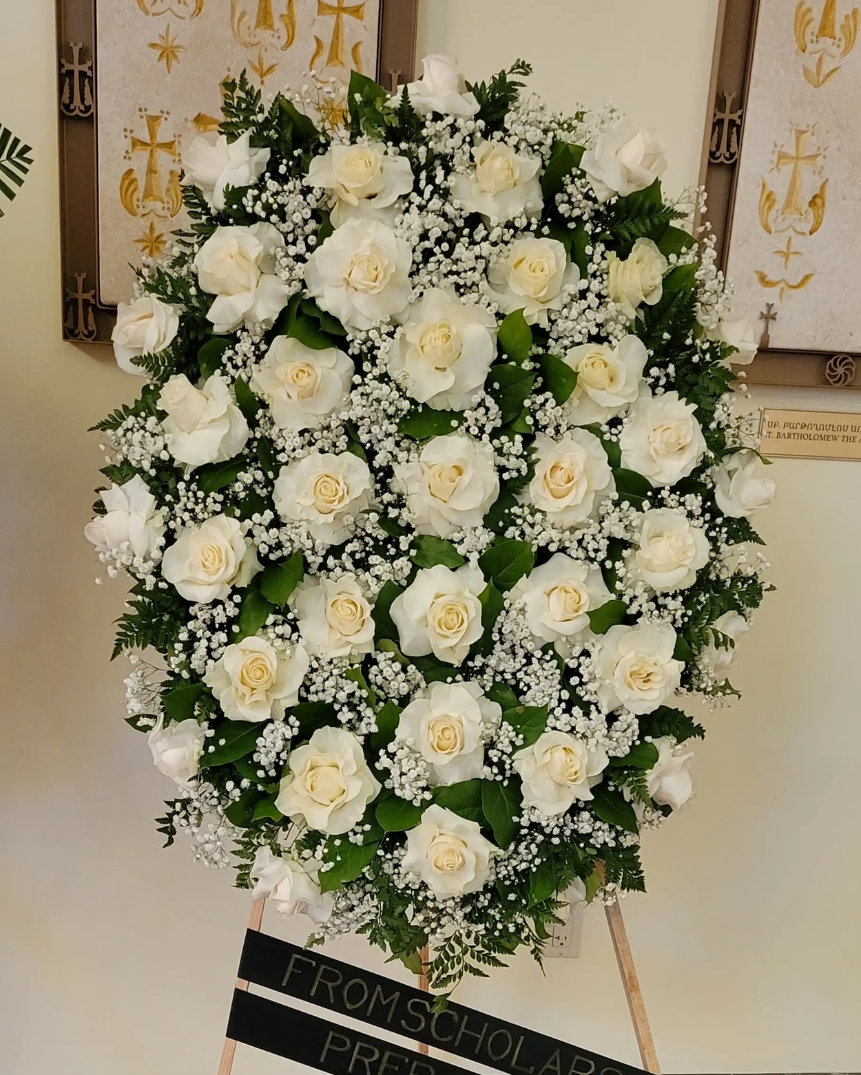 This elegant oval funeral wreath is composed of pure white roses and daisies, surrounded by lush greenery. The serene white blooms symbolize peace and purity, while the greenery adds a natural, calming touch. Thoughtfully designed, this wreath serves as a beautiful and heartfelt tribute to honor the memory of a loved one, offering comfort and sympathy during a time of loss. STANDARD size is shown in the main picture.