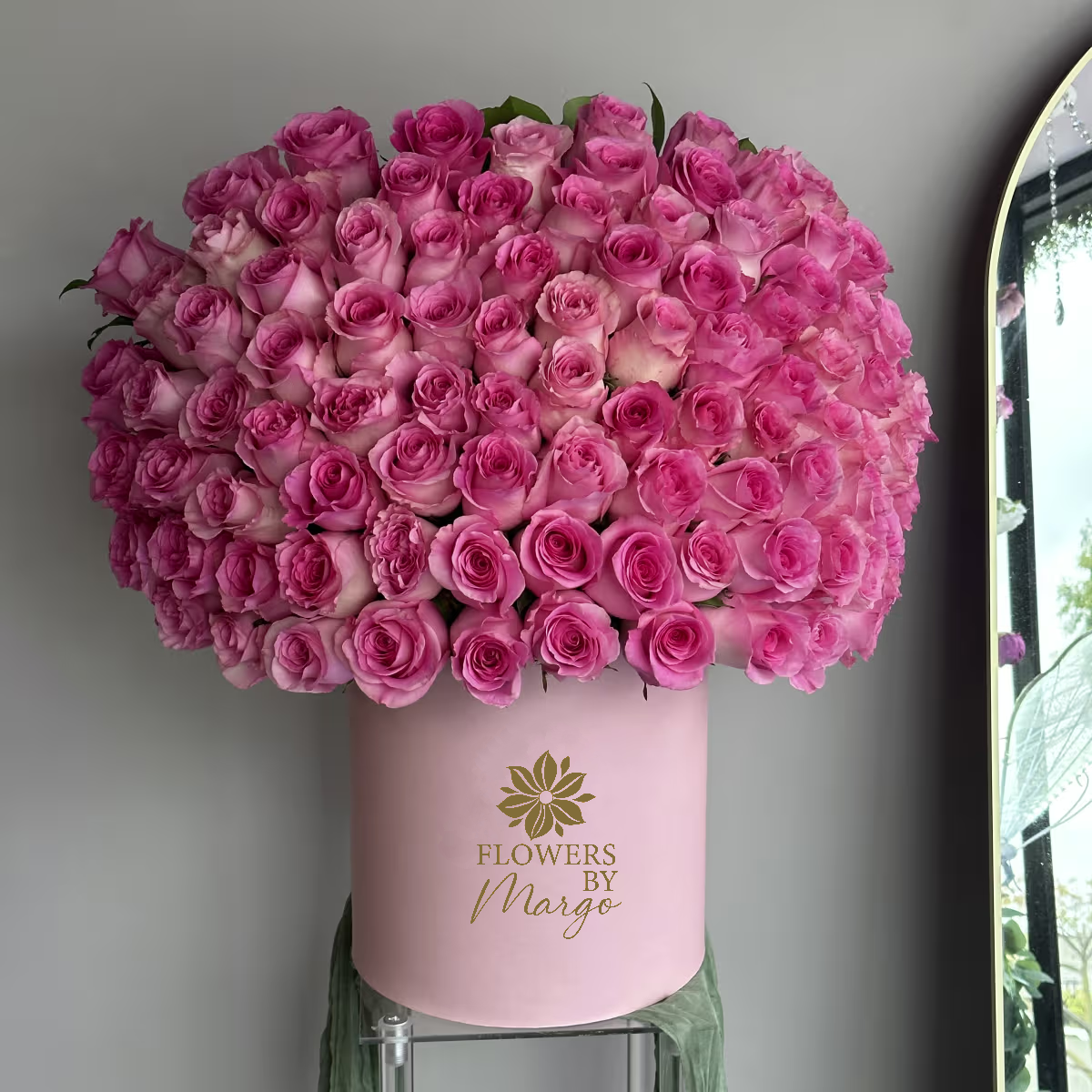 PREMIUM size is shown in the main picture. Surprise someone special with an unforgettable sea of pink. Our Pink Majesty Arrangement features up to 100 fresh pink roses, hand-arranged in a signature blush hatbox from Flowers By Margo. Each bloom is selected for its vibrant tone and long-lasting beauty, creating a statement piece that feels both luxurious and romantic. Perfect for the upcoming Valentine's Day!