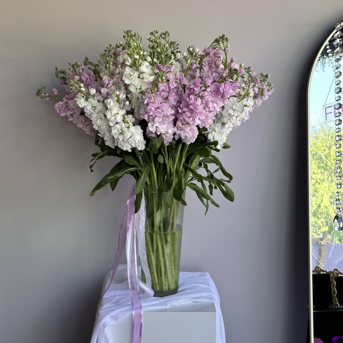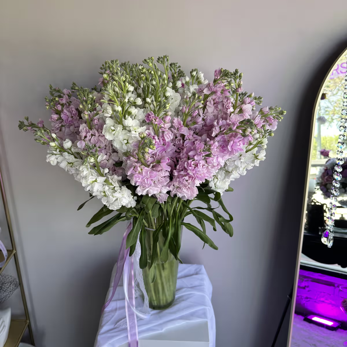 • Pure, fragrant stock arranged in a clear vase. Simple, fresh, and effortlessly stylish.