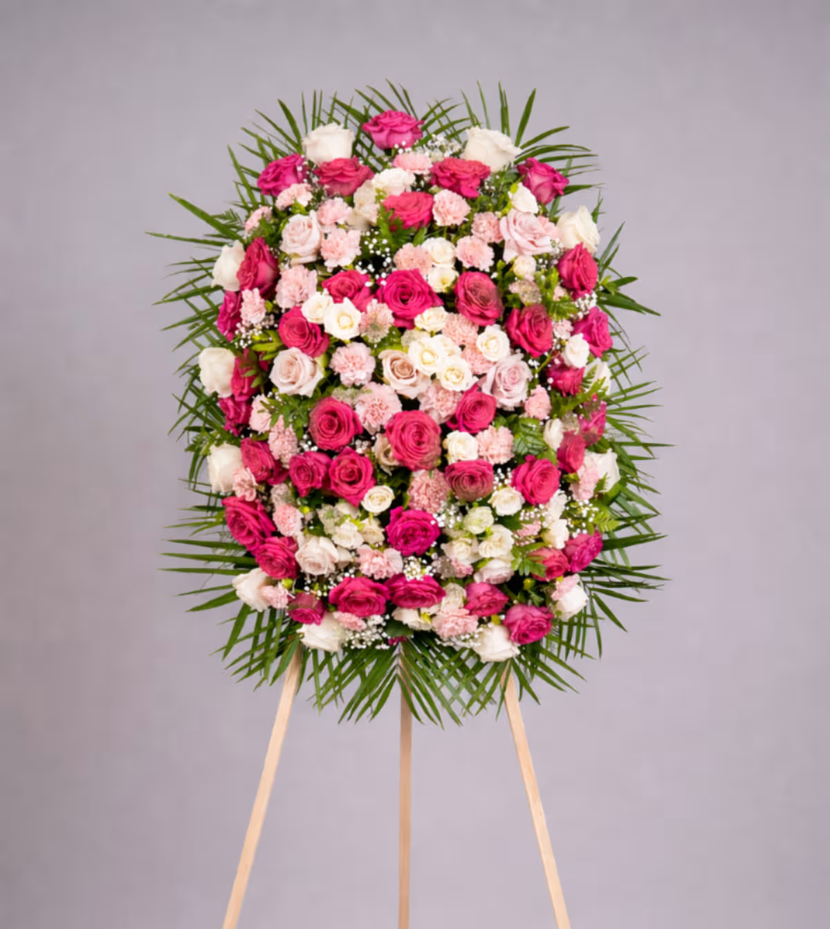 • A beautiful and serene arrangement of pink and white roses, carnations, and delicate greenery, this funeral wreath is a thoughtful tribute. Ideal for memorial services, it offers peace and elegance in honor of a loved one.