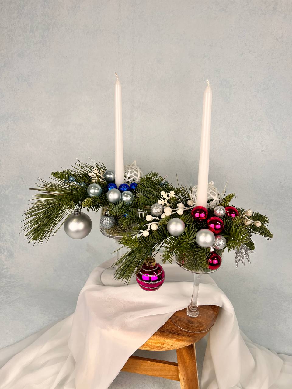 A refined winter centerpiece crafted with holiday evergreens, blue and silver ornaments, and a tall taper candle for a clean, elegant look. Perfect for Christmas parties, dining tables, and winter home decor.